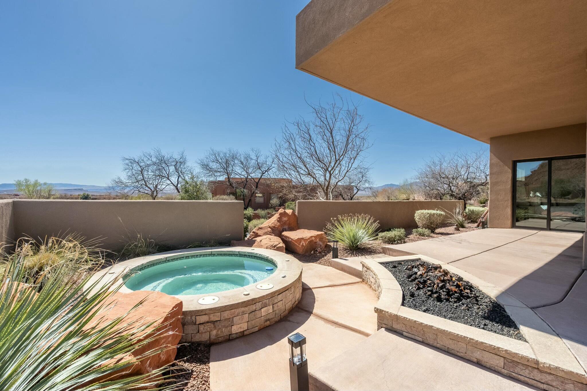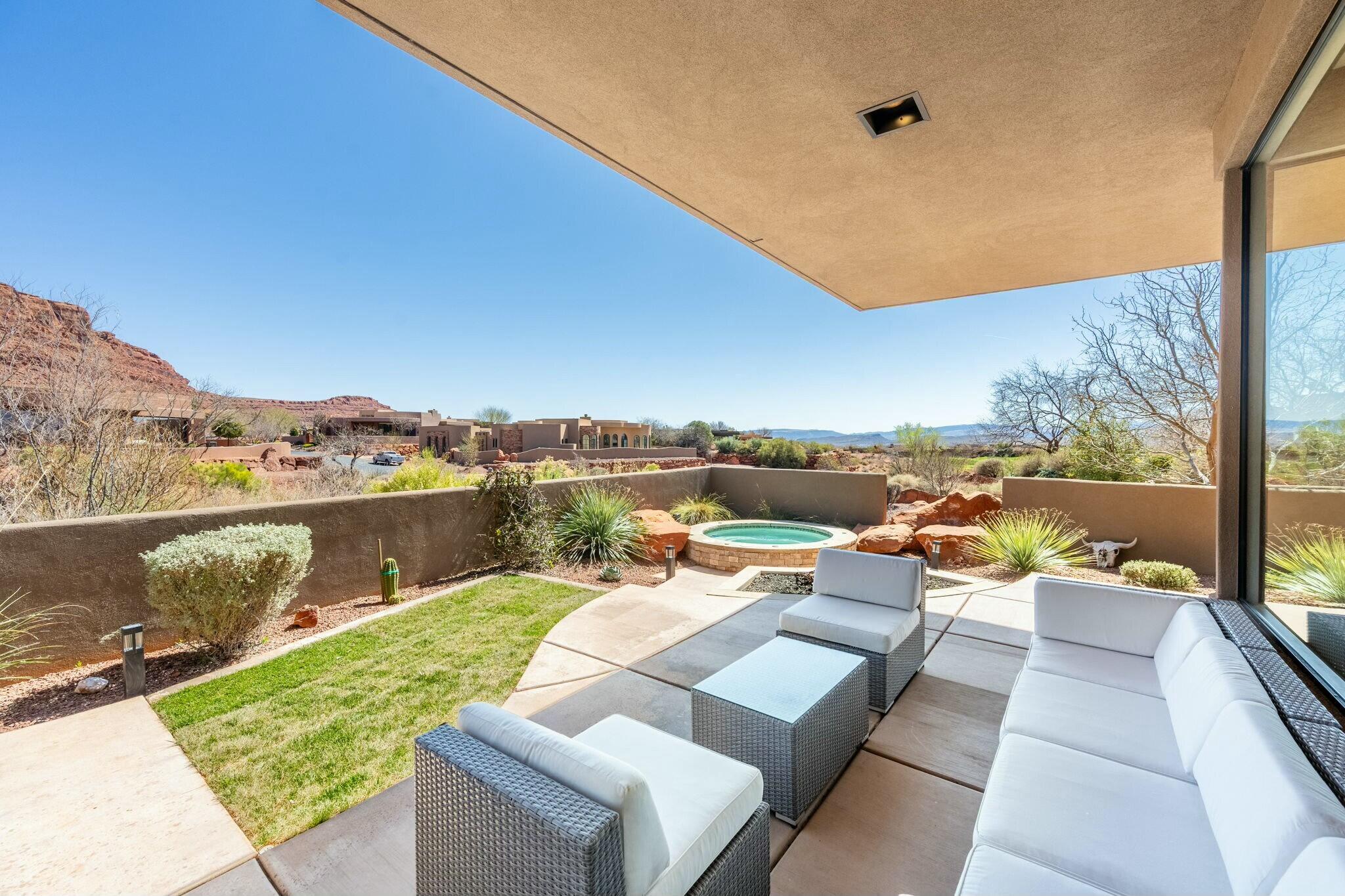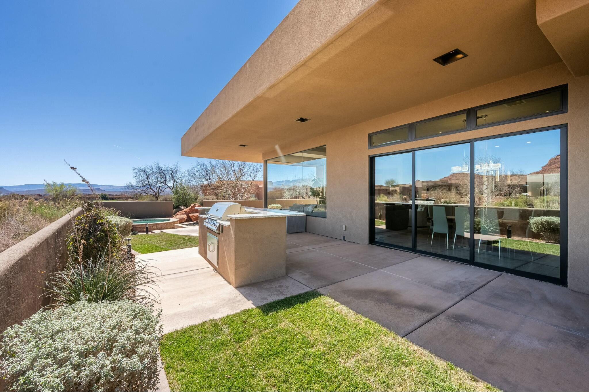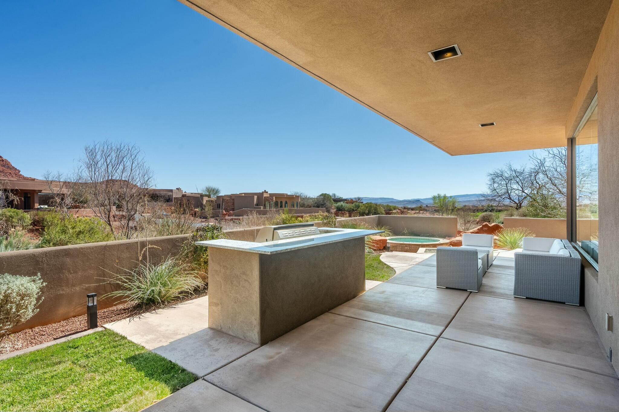 The backyard is perfect for enjoying the outdoors, complete with a built-in barbecue, private jacuzzi, and plenty of space to take in the surrounding beauty.