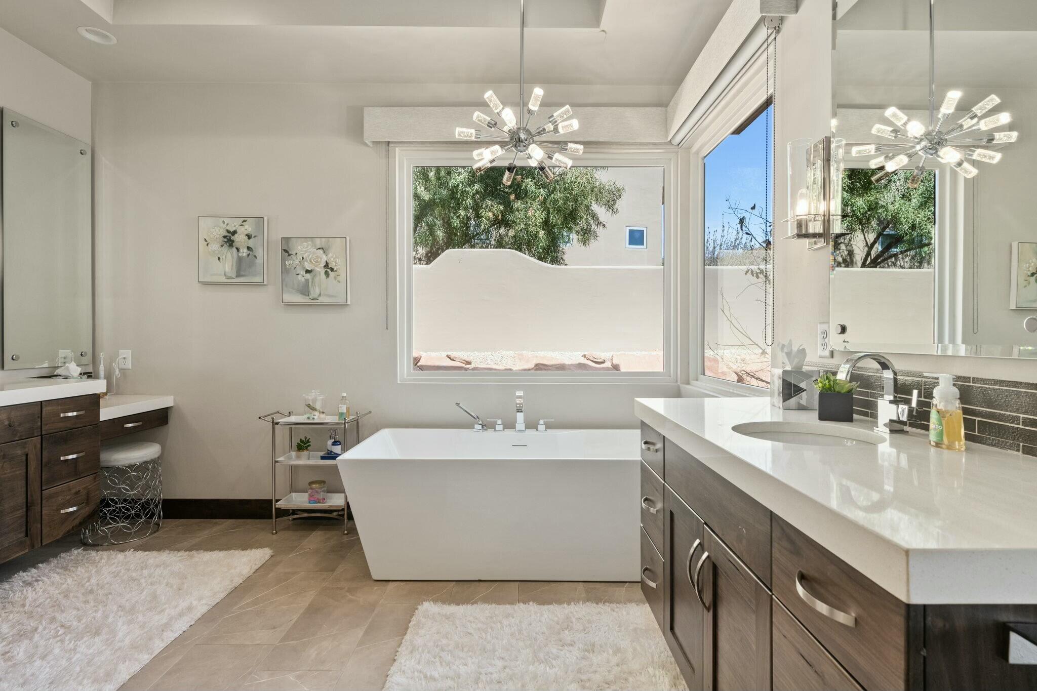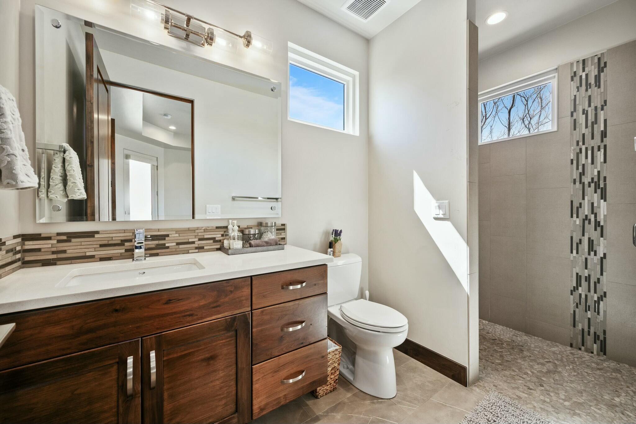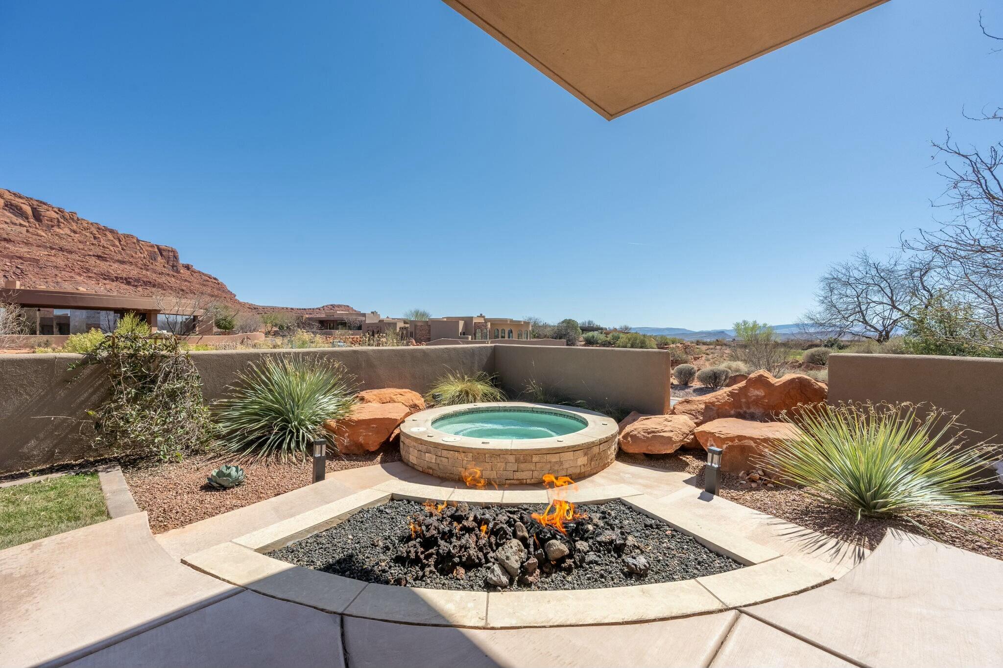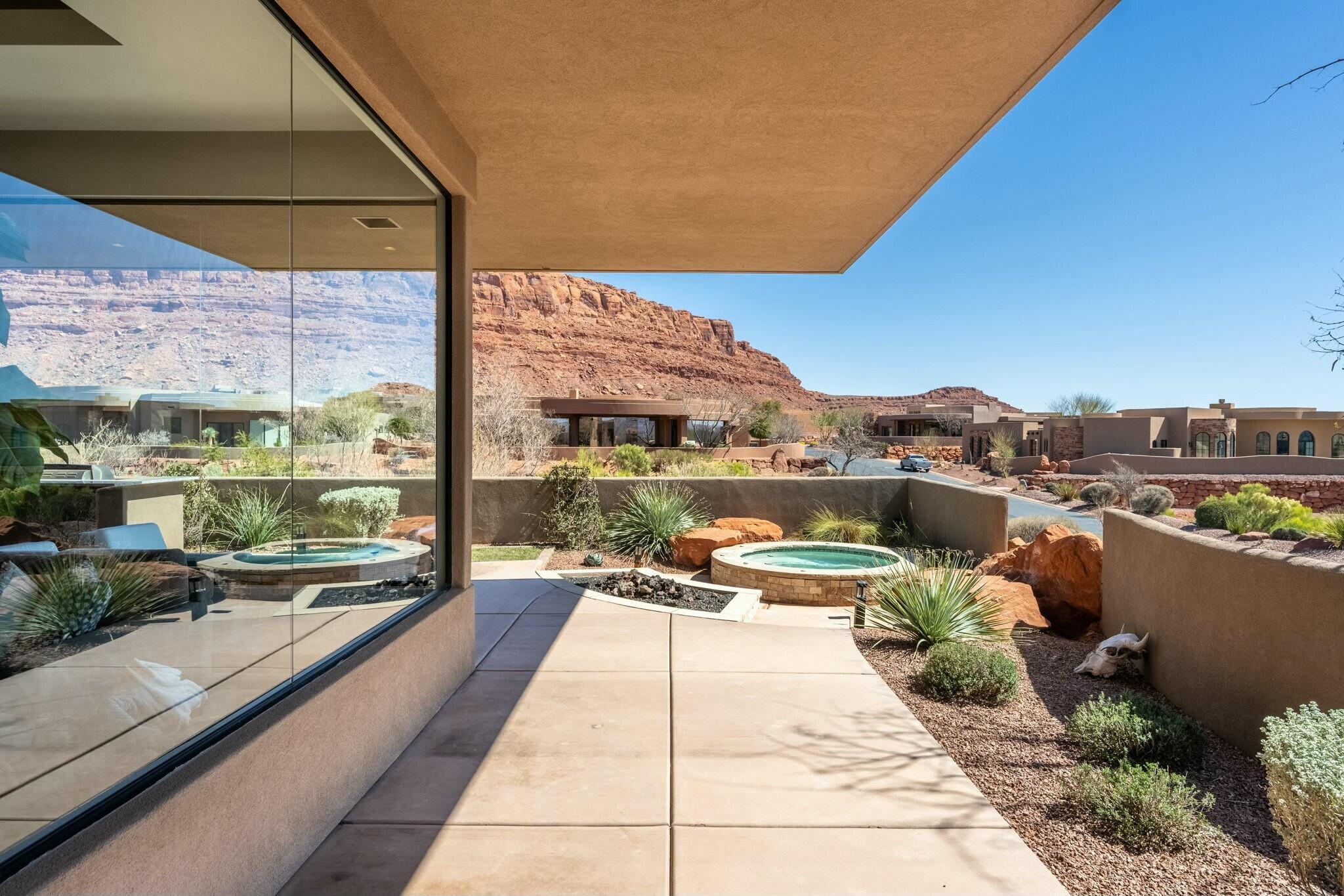 The backyard is perfect for enjoying the outdoors, complete with a built-in barbecue, private jacuzzi, and plenty of space to take in the surrounding beauty.