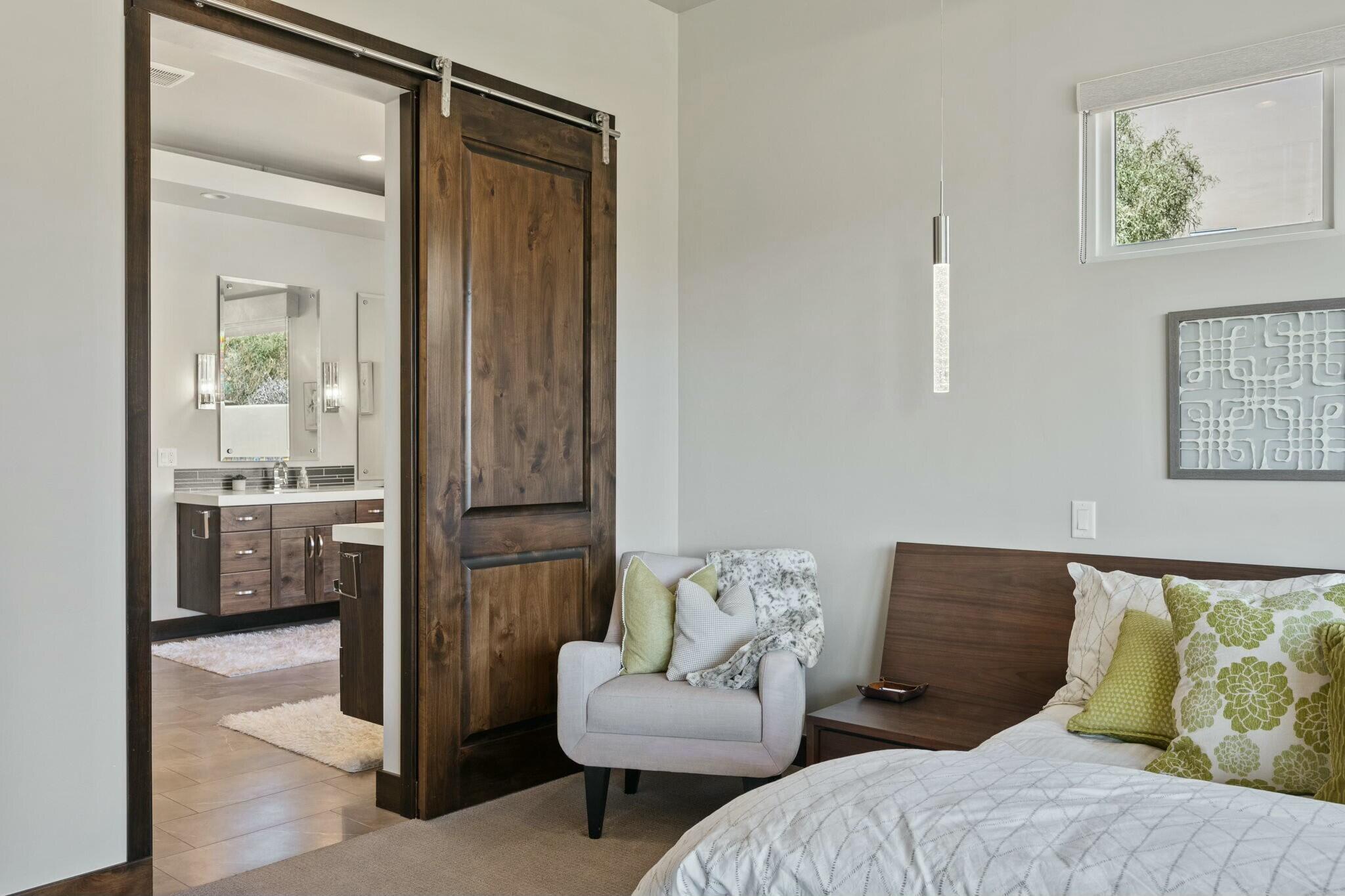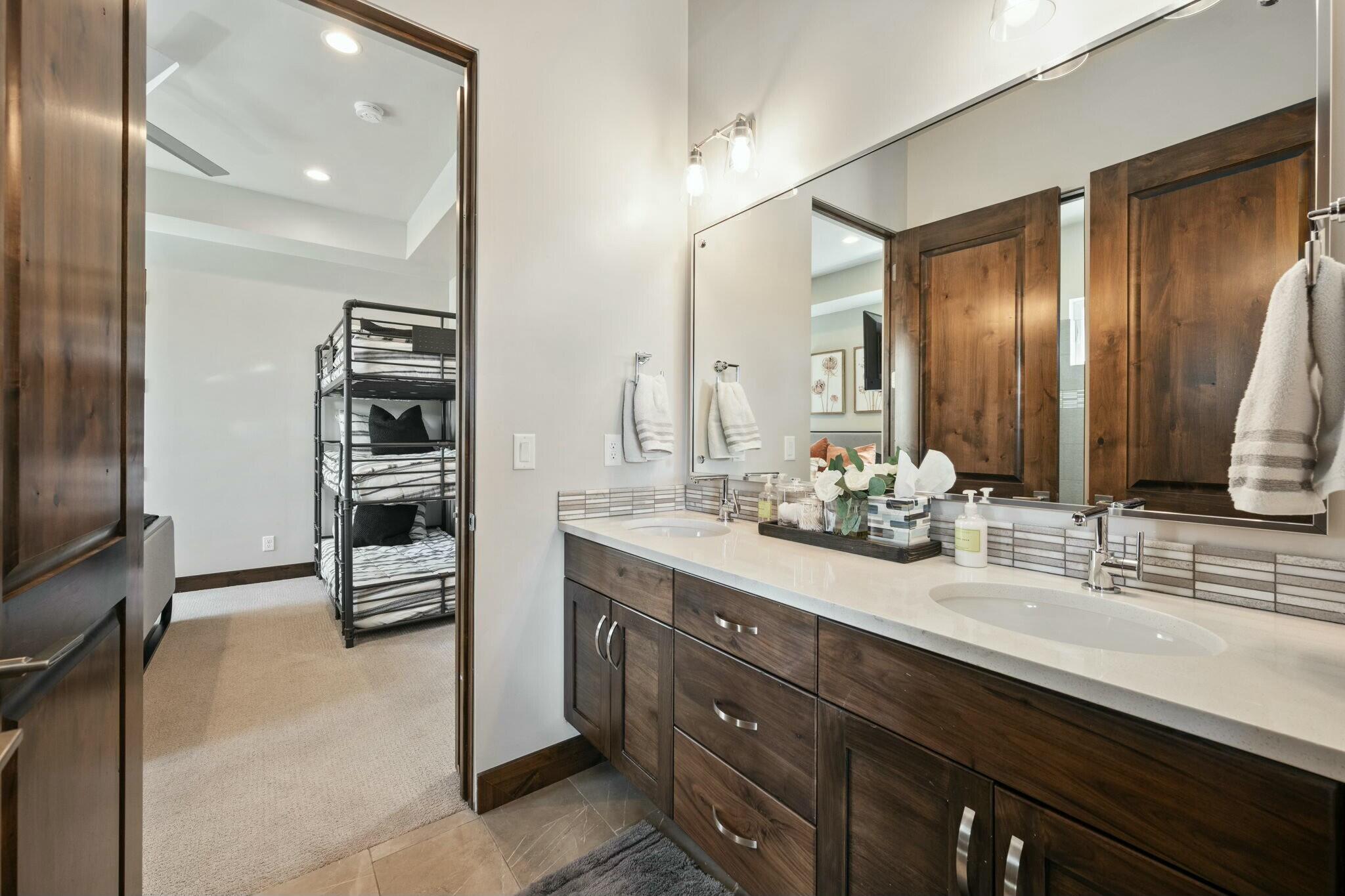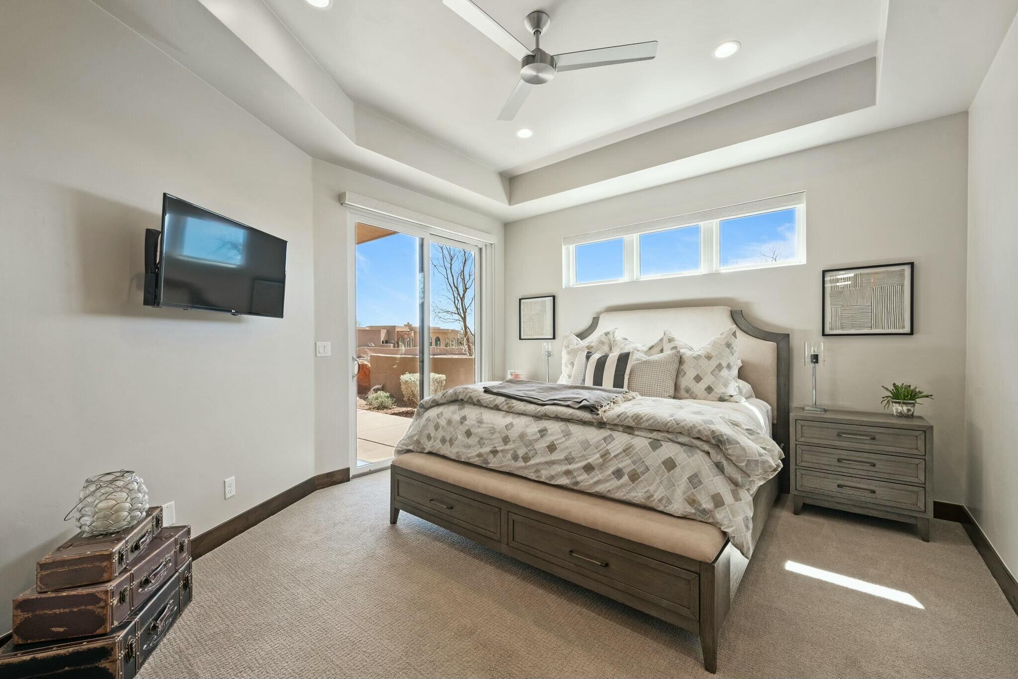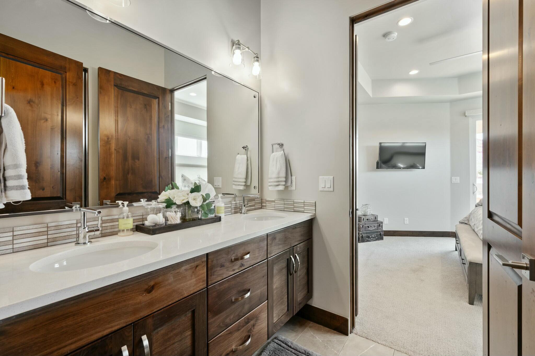 The backyard is perfect for enjoying the outdoors, complete with a built-in barbecue, private jacuzzi, and plenty of space to take in the surrounding beauty.